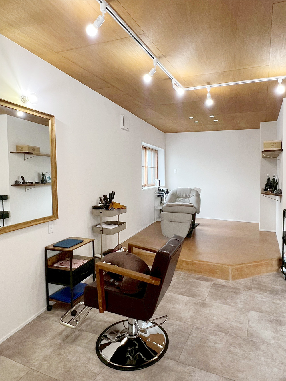 足元を支えるモルタル調のタイル。